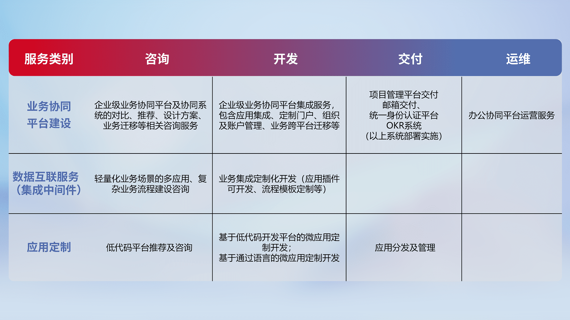 针对钉钉、、、、企微、、、、IDaas等平台级产品提供产品的规划、、方案、、、交付、、、、定制化开发等服务,,实现如统一协同办公、、智能客户服务、、、混合会议管理、、、、智能数据查询、、等业务场景,,,,实现数字化转型。。